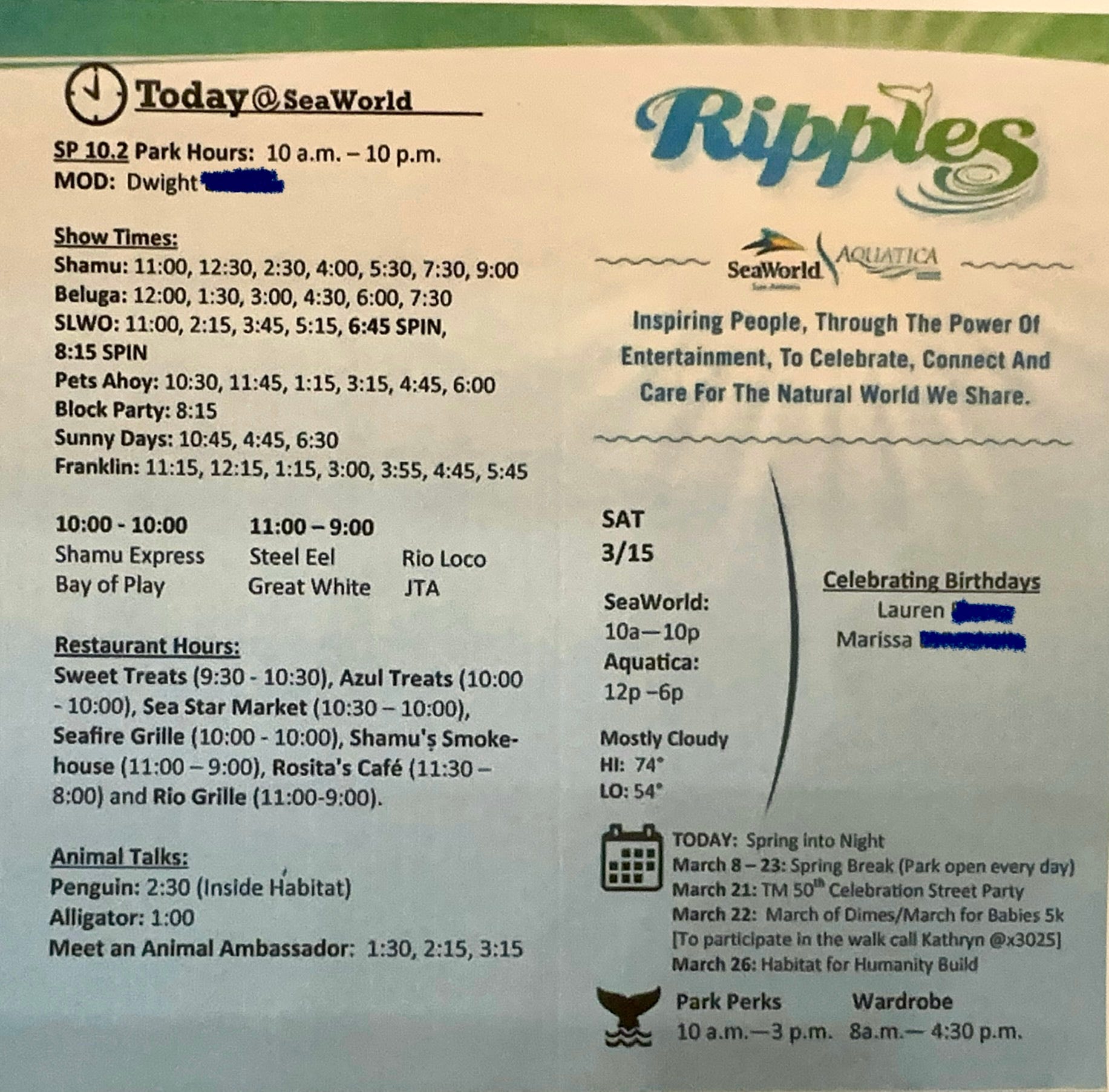 The park president, the VP of human resources, and I collaborated on a new communications matrix structure to ensure that messages were flowing through the organization. We outlined how messages would be filtered through in-person meetings, e-mails, and daily operation bulletins. On any given day during the summer, we were issuing communications to more than 2,000 staff members through standup meetings, PA announcements, and TV screens in break areas. It was imperative that we kept our frontline team engaged as they had the most influence over the guest/customer experience.